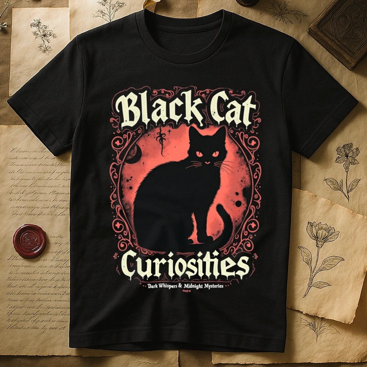 Black Cat Curiosities T-Shirt - Gothic Literary Graphic Tee for Dark Academia Fans